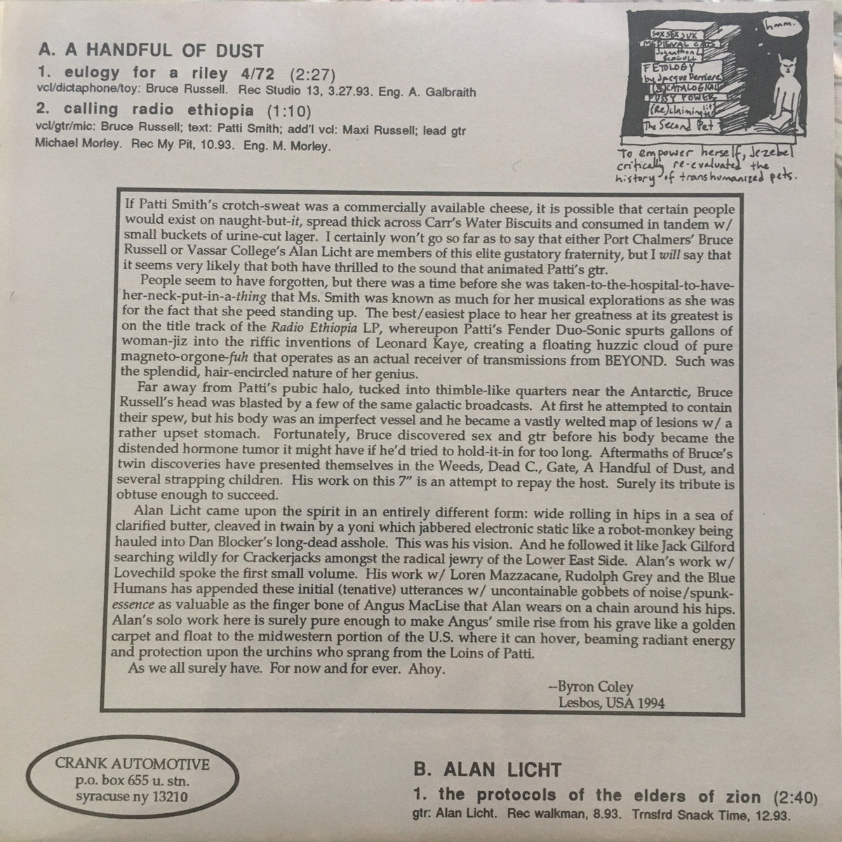 Original copies from 1994. Issued with Marc Masters' Crank magazine #4, which had extensive interviews with me and Bruce Russell (A Handful of Dust, Dead C). Liner notes by Byron Coley. My track is an outtake from my first solo guitar album, Sink the Aging Process (Siltbreeze).